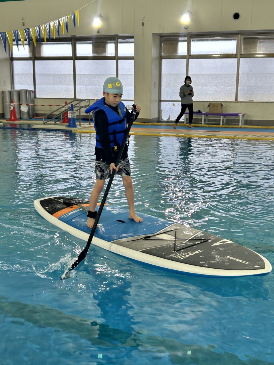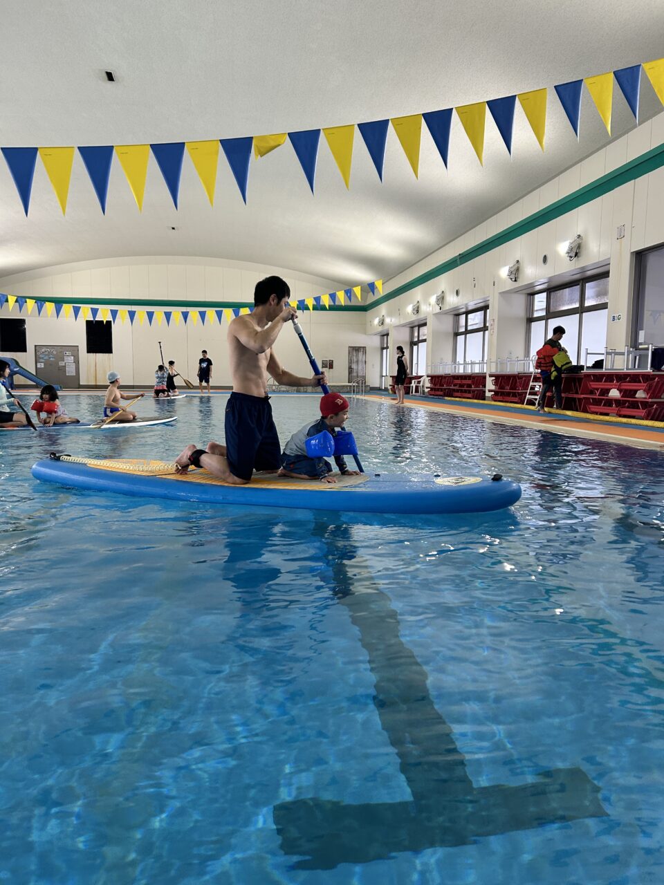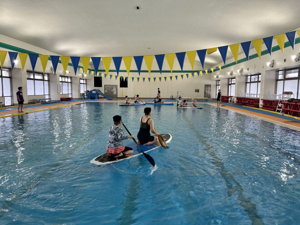 まずはプールサイドでなぎさ公園スタッフの方にサップの指導をしていただき